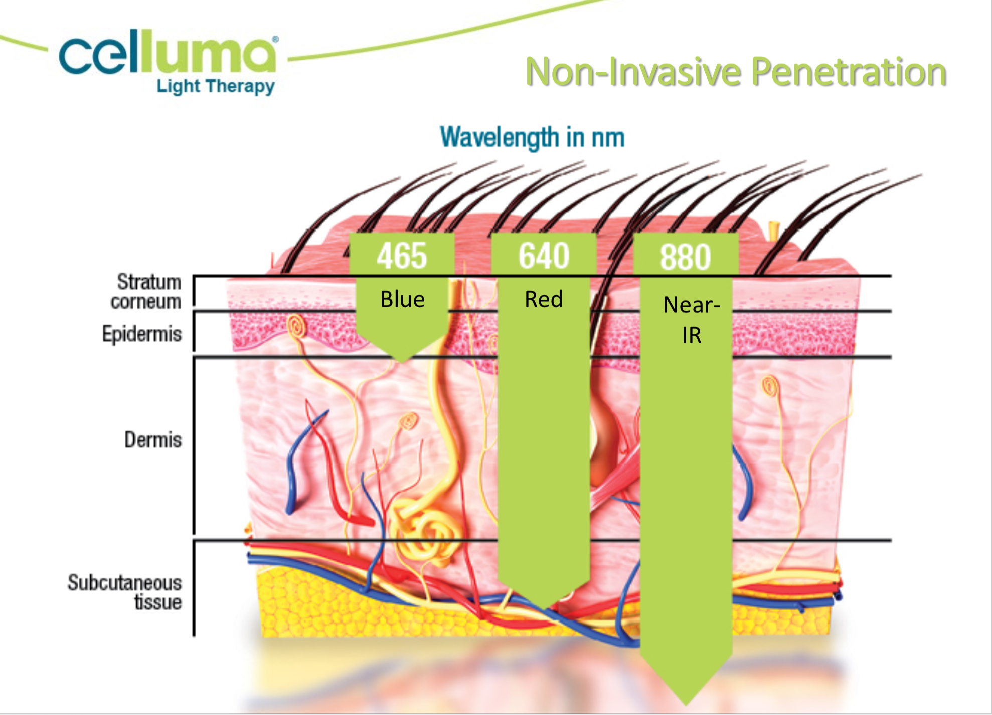 When light energy (photons) is absorbed by photo-acceptors in the mitochondria - often referred to as the “powerhouse” of the cell - it helps increase the production of ATP (adenosine triphosphate), the cell’s main energy source. This boost in cellular energy supports processes involved in repair, regeneration, and the restoration of healthy tissue.